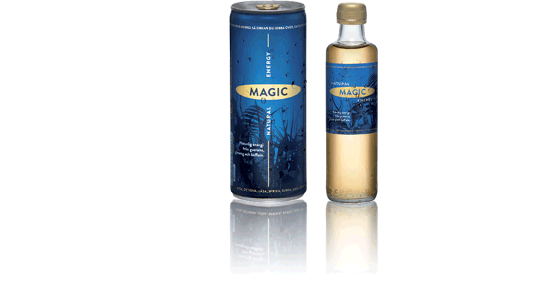 Magic är en energidryck av naturliga råvaror. Utan konstgjorda sötnings-, konserverings-, färg-, eller smakämnen. Inför en stor relansering behövdes ny logotype och karaktärsskapande grafik till burkar, flaskor, kartonger, butiksställ mm. Förutom en grafisk manual skapades också en bank av bilder och annat PR-material.